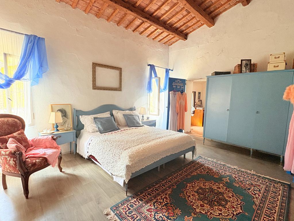 Una camera matrimoniale molto luminosa, con travi a vista e affaccio panoramico;